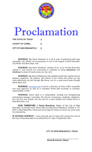 Listen to the Mayor of New Braunfels proclamation about Serve Spot/Big Serve Weekend at the 3 minute mark.